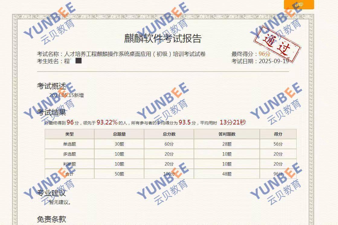 麒麟操作系统工程师(桌面)KYCA认证成绩展示: