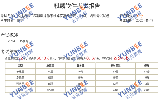 麒麟操作系统桌面高级工程师 KYCP成绩展示