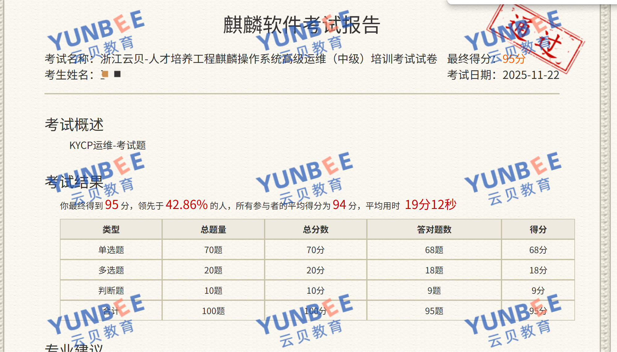 麒麟操作系统高级工程师(运维)KYCP认证成绩展示: