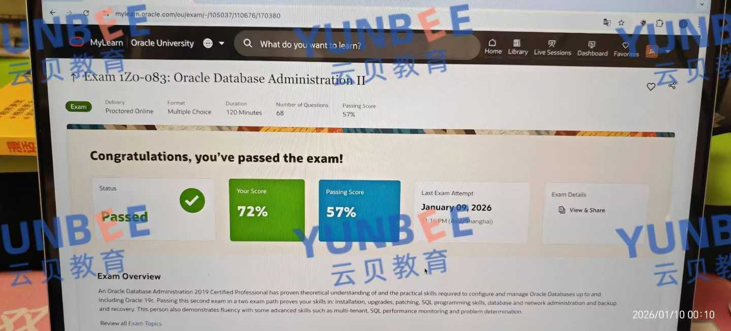 Oracle 19c OCP升级考试成绩展示: