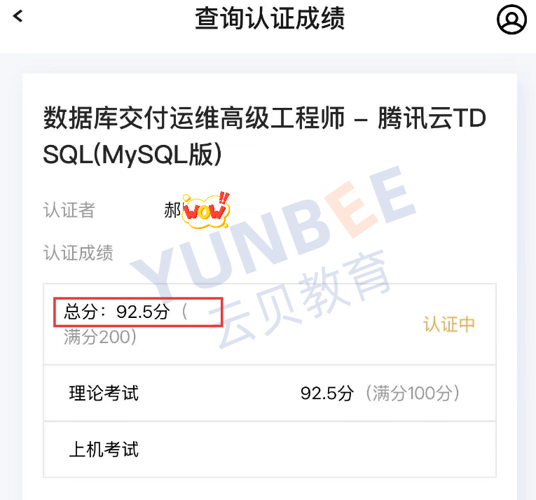 数据库交付运维高级工程师-腾讯云 TDSQL(MySQL版) TCCP 理论考试成绩展示: