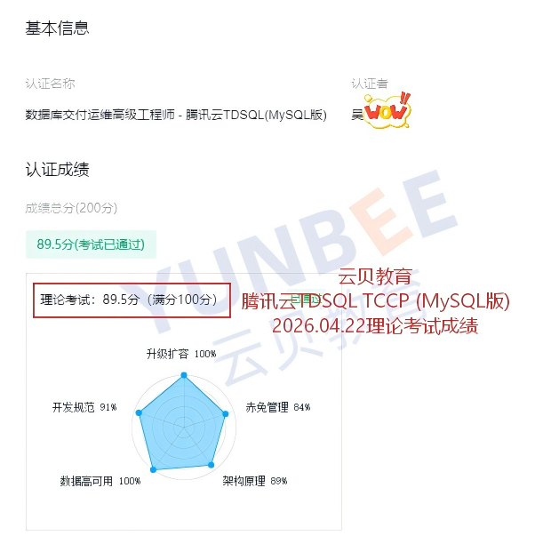 【喜报】恭喜Wu同学通过 数据库交付运维高级工程师-腾讯云 TDSQL(MySQL版) TCCP 理论考试