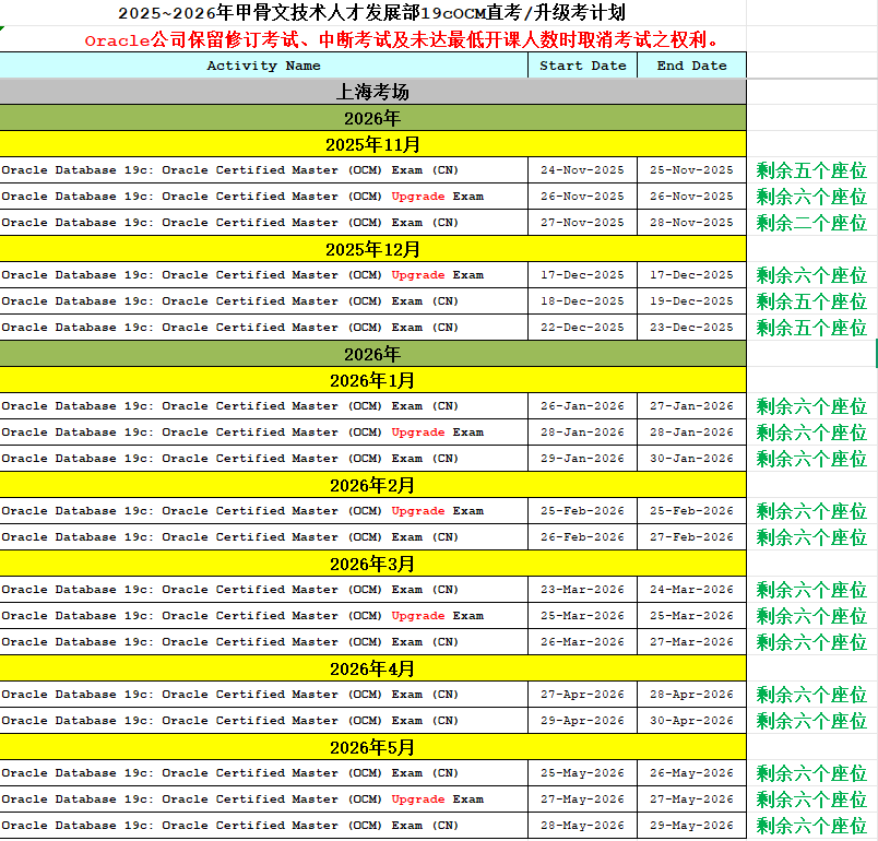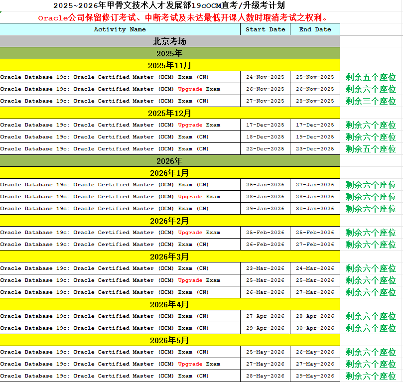 2025年11月-2026年5月 Oracle 19c OCM 考试安排: