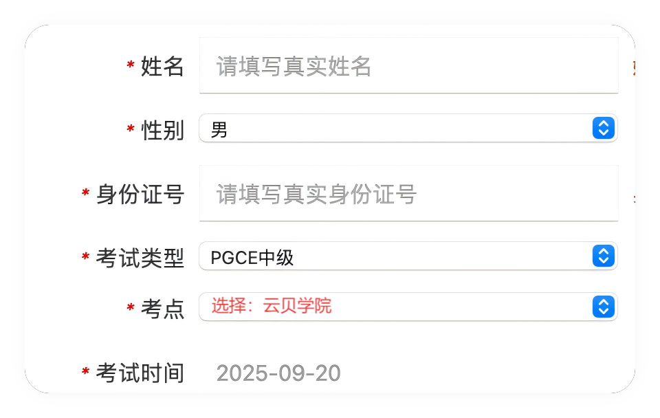 (二)第二步(报名):登录/注册后进入考试报名页面,填写报名信息