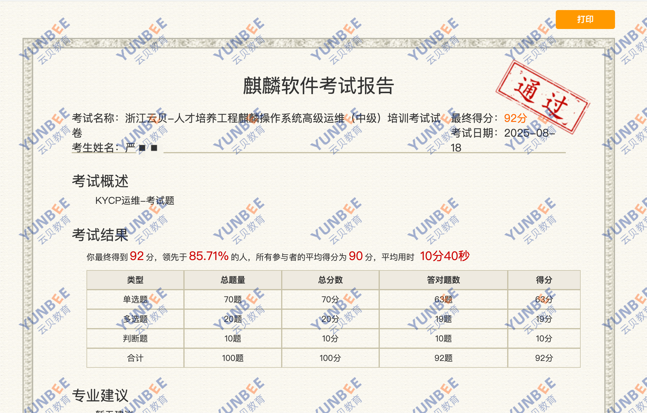 【喜报】恭喜ZeHao Yan同学通过麒麟操作系统高级工程师(运维)KYCP认证