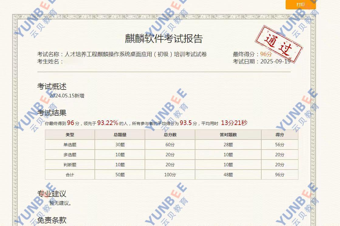 麒麟操作系统工程师(桌面)KYCA认证成绩展示: