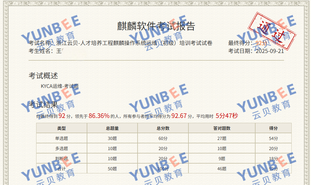 【喜报】恭喜zhao rui wang同学通过麒麟操作系统桌面工程师KYCA 认证