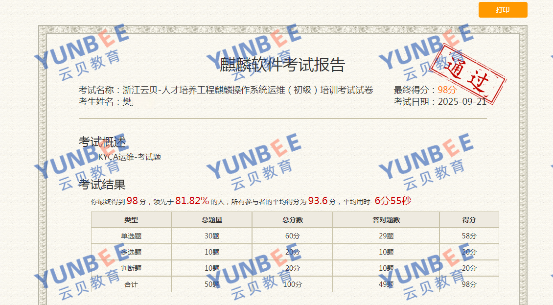 【喜报】恭喜Yongli Fan同学通过麒麟操作系统运维工程师 KYCA 认证