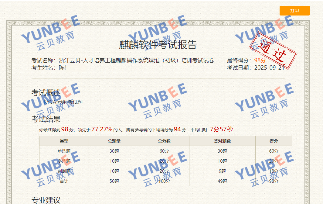 【喜报】恭喜Xiangyu Chen 同学通过麒麟操作系统运维工程师 KYCA 认证