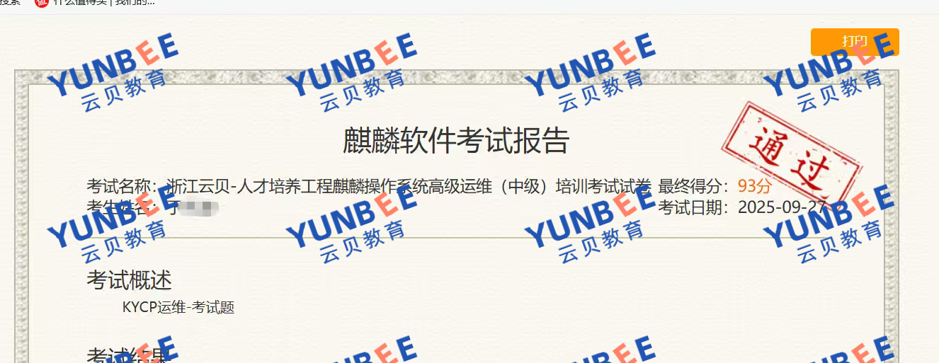 麒麟操作系统高级工程师(运维)KYCP认证成绩展示:
