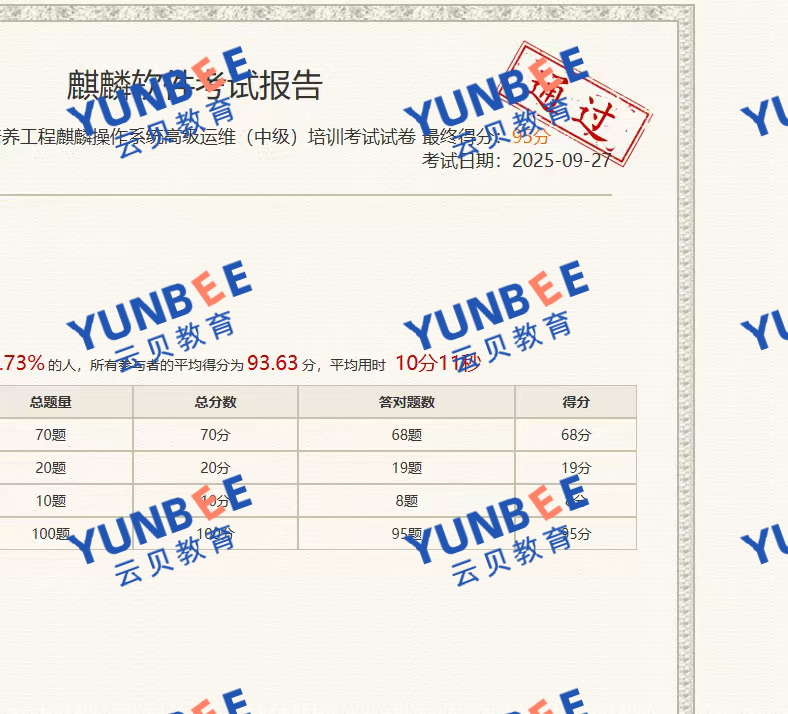 麒麟操作系统高级工程师(运维)KYCP认证成绩展示: