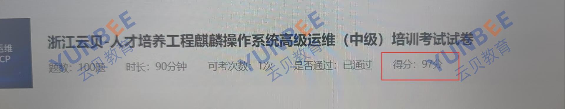 麒麟操作系统高级工程师(运维)KYCP认证成绩展示: