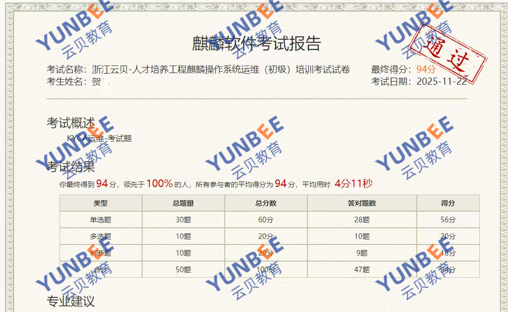 【喜报】恭喜Jie He同学通过麒麟操作系统运维工程师 KYCA 认证