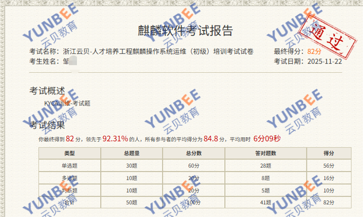 【喜报】恭喜Jie Zou同学通过麒麟操作系统运维工程师 KYCA 认证