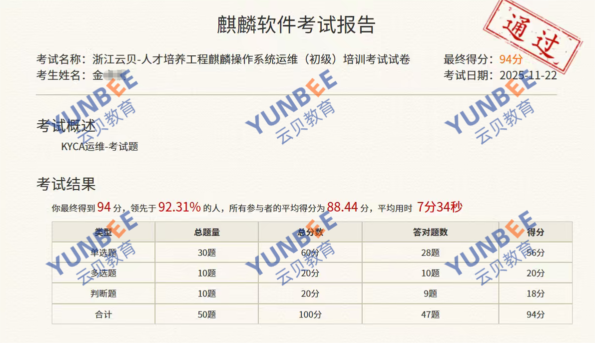 【喜报】恭喜ZhuoQuan Jin同学通过麒麟操作系统运维工程师 KYCA 认证