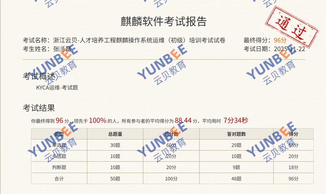 【喜报】恭喜ZeLei Zhang同学通过麒麟操作系统运维工程师 KYCA 认证