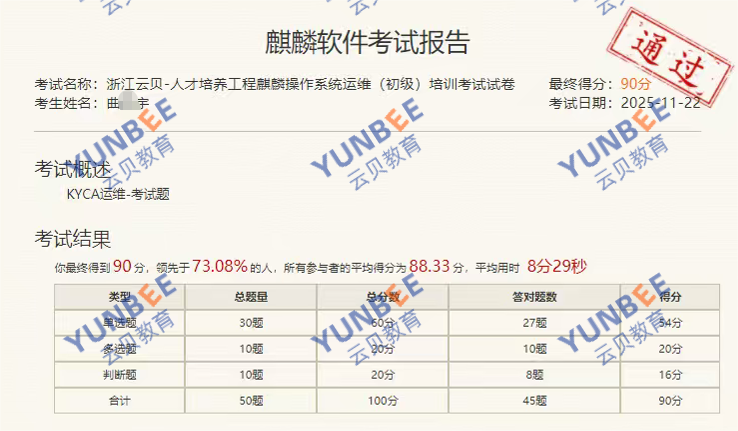 【喜报】恭喜TongYu Qu同学通过麒麟操作系统运维工程师 KYCA 认证