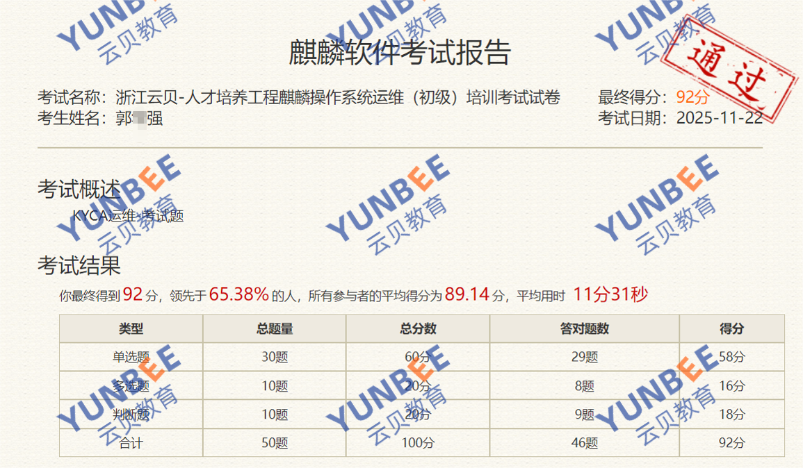【喜报】恭喜HuaQiang Guo同学通过麒麟操作系统运维工程师 KYCA 认证