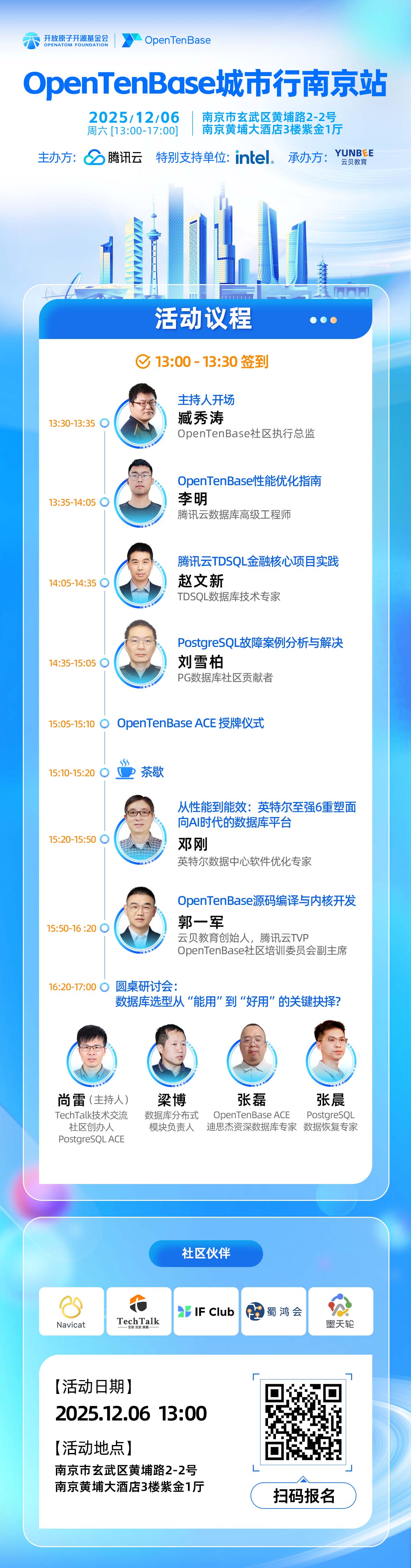 12月6日(本周六),OpenTenBase城市行南京站将在南京黄埔大酒店启幕!这里有前沿趋势解读、硬核实践分享、大咖面对面交流,邀你共探智能时代数据库技术的核心密码!