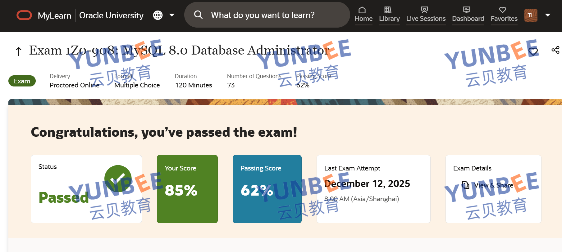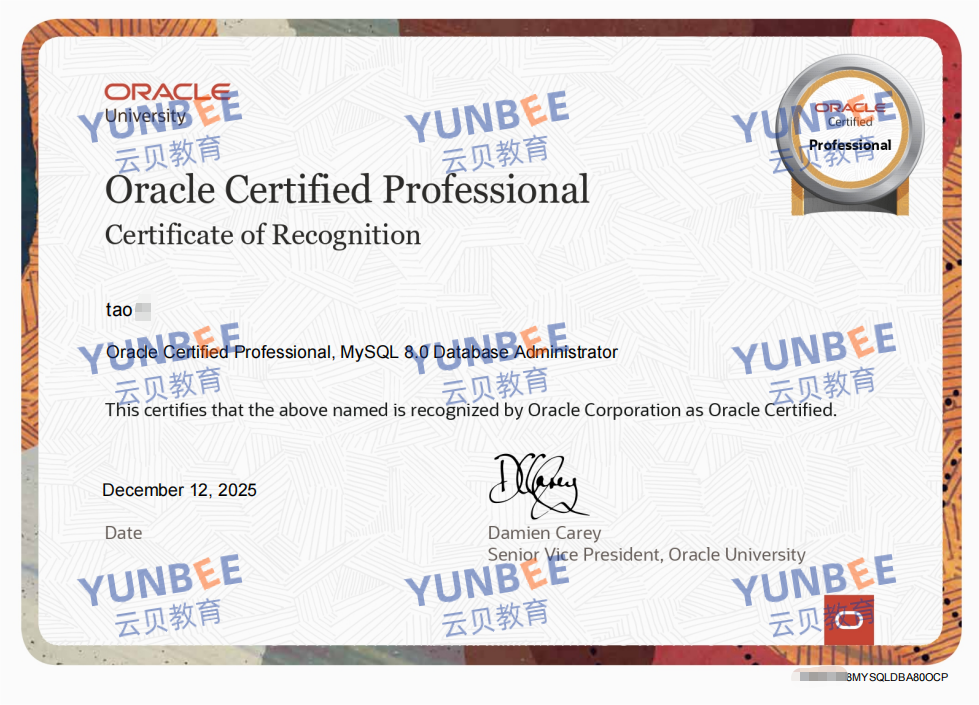 【喜报】恭喜Tao Li同学通过MySQL 8.0 OCP考试