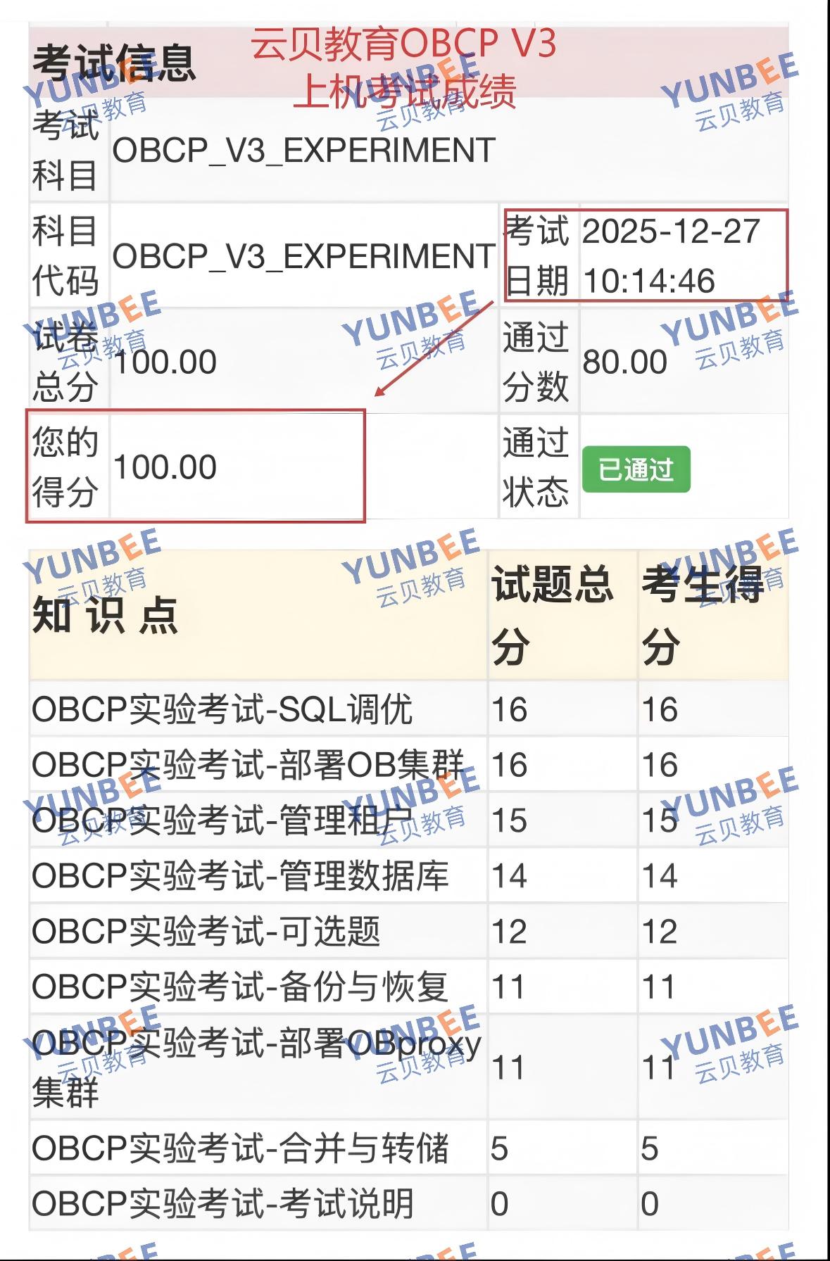 OceanBase OBCP V3.0 理论成绩展示: