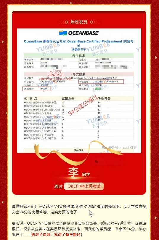 喜报!云贝学员94分高分通关OBCP V4,信创风口证书闭眼冲!