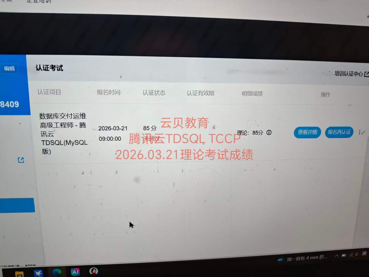 数据库交付运维高级工程师-腾讯云 TDSQL(MySQL版) TCCP 理论考试成绩展示: