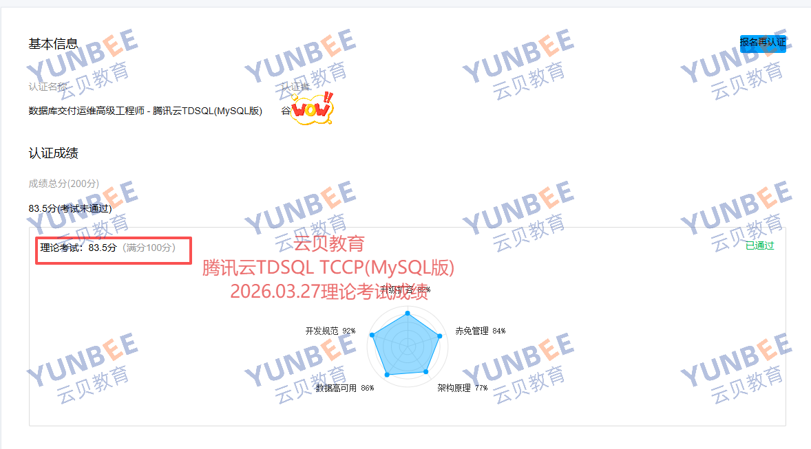 数据库交付运维高级工程师-腾讯云 TDSQL(MySQL版) TCCP 理论考试成绩展示: