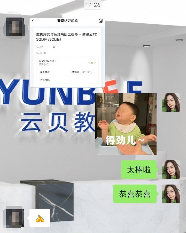 数据库交付运维高级工程师-腾讯云 TDSQL(MySQL版) TCCP 理论考试成绩展示: