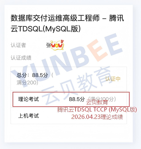 【喜报】恭喜Zhang同学通过 数据库交付运维高级工程师-腾讯云 TDSQL(MySQL版) TCCP 理论考试
