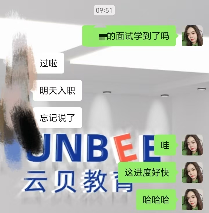 区别于普通培训机构“只培训不负责就业”的模式,云贝教育把就业服务做到极致: